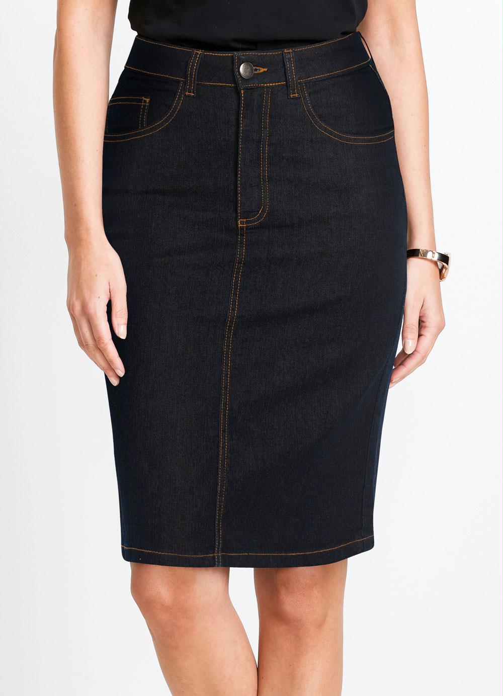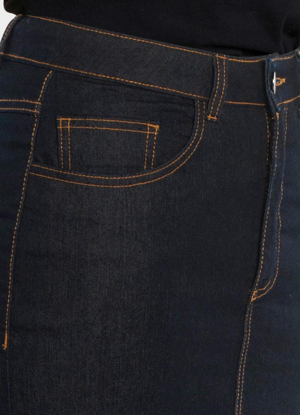 Saia de jeans com elastano. Possui cós com passantes, fechamento com botão e zíper, bolsos frente e costas funcionais. Cintura alta. Comprimento no joelho.