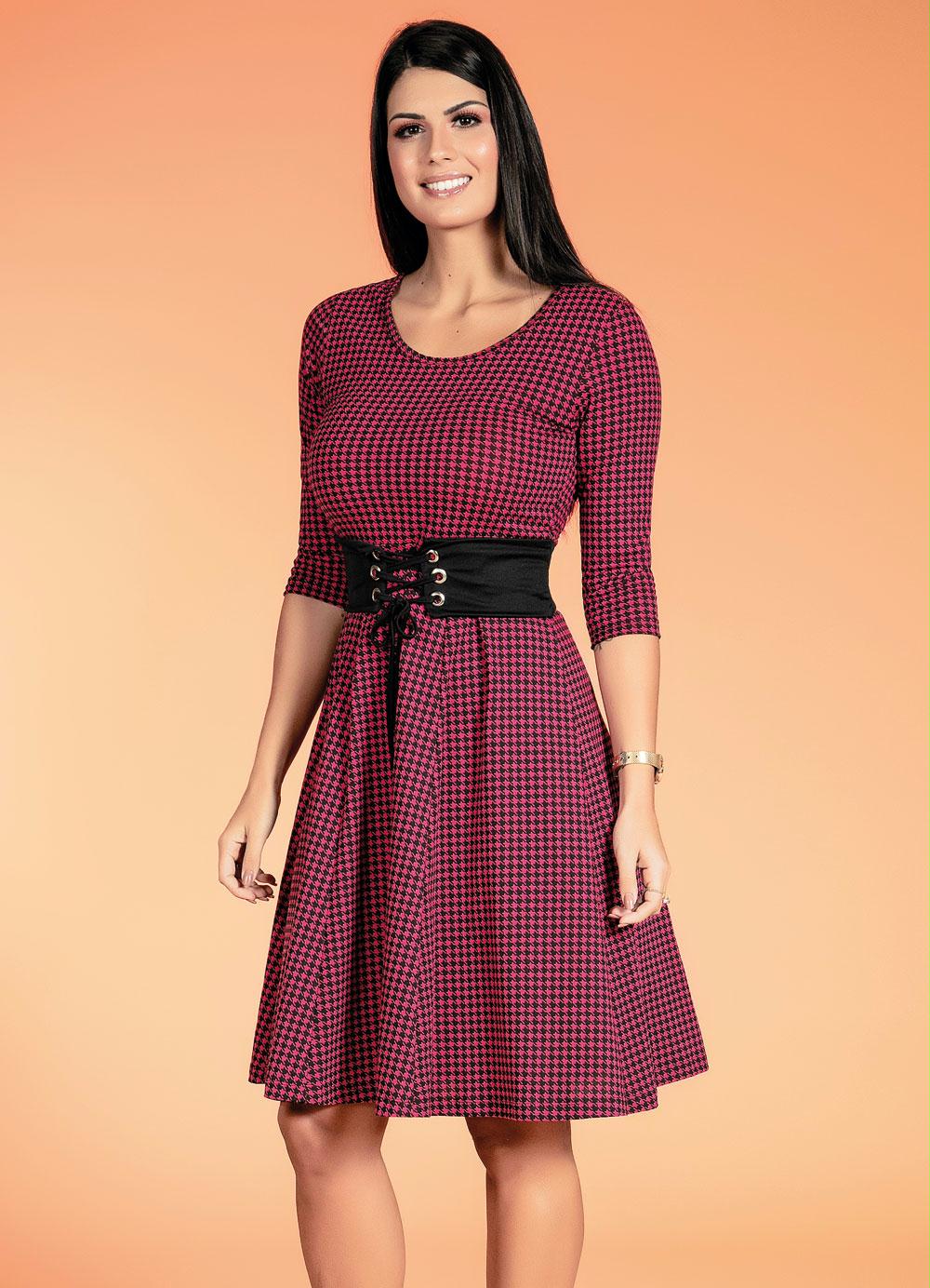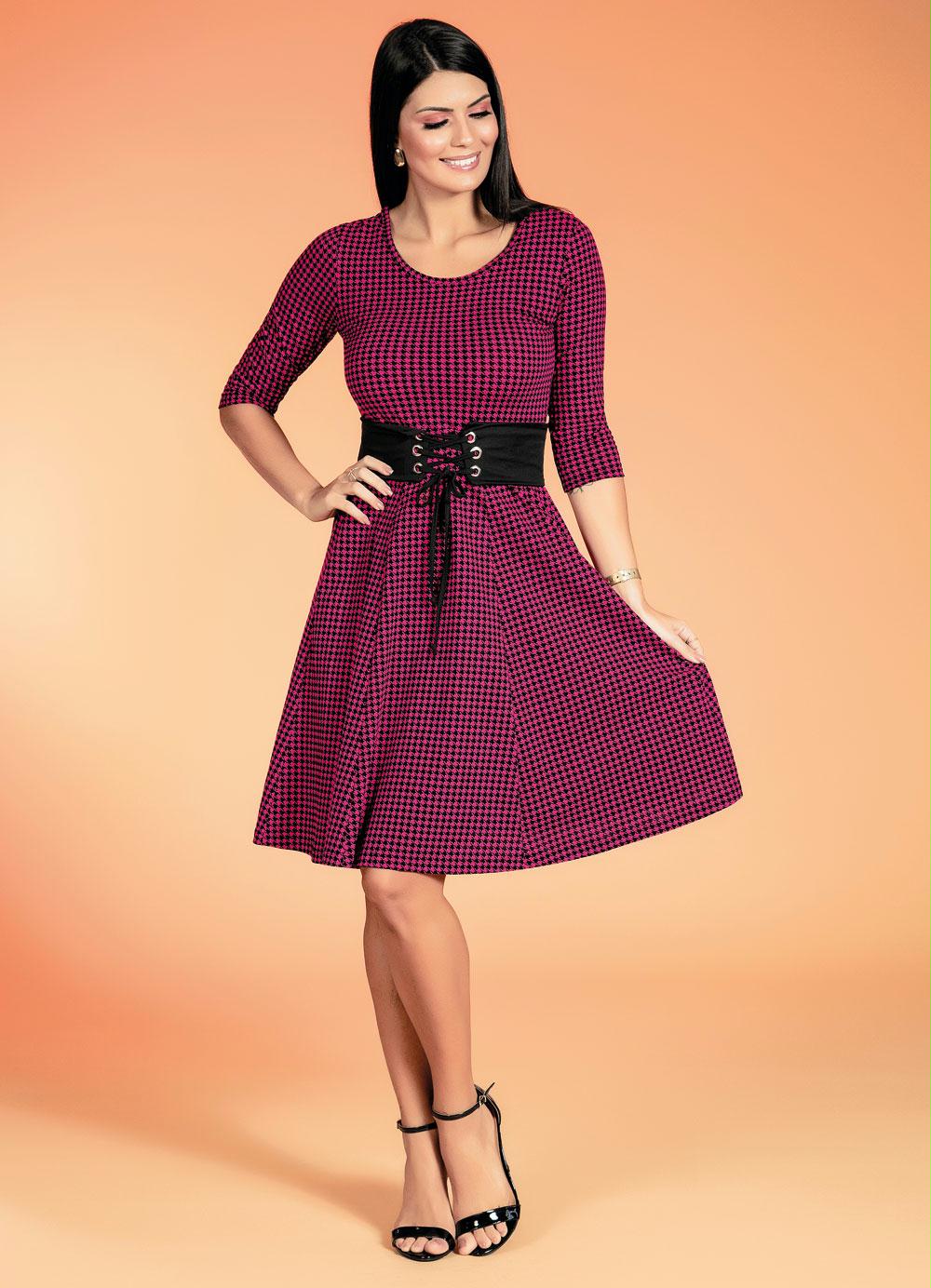 Rosalie – Vestido com Mangas 7/8 Pied de Poule Rosa