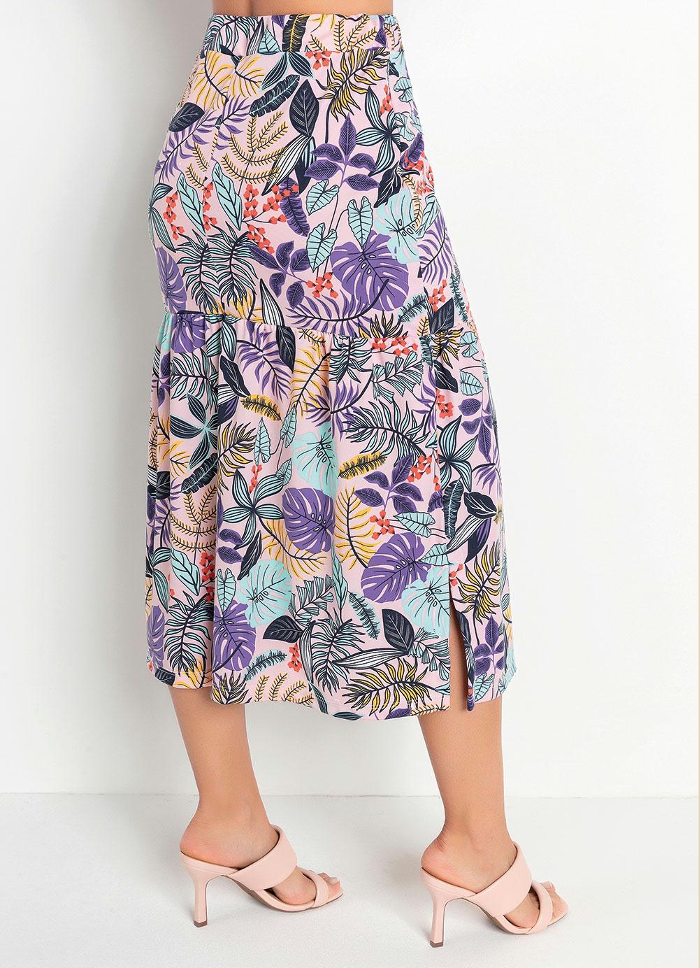 Rosalie – Saia Floral Rosa com Fendas Moda Evangélica